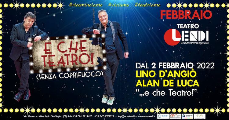 Dopo il successo televisivo nella scorsa primavera, Lino D’Angiò e Alan De Luca sono pronti a tornare sul palco del Teatro Lendi insieme al cast di artisti di “…e che Teatro!”, tre esilaranti appuntamenti live ricchi di risate e musica. Lo spettacolo, prodotto da Giofralus di Francesco Scarano e MusicaèManagement di Giovanni Oliviero, è in programma mercoledì 2, giovedì 3 e venerdì 4 febbraio con inizio alle ore 21:00.
