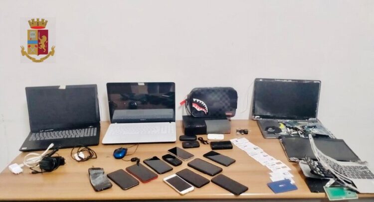 hanno udito delle voci provenienti da un garage in cui, una volta entrati, hanno sorpreso quattro persone che avevano installato altrettante postazioni con computer collegati alla rete Wi-Fi con 10 cellulari nonché numerose attrezzature informatiche.