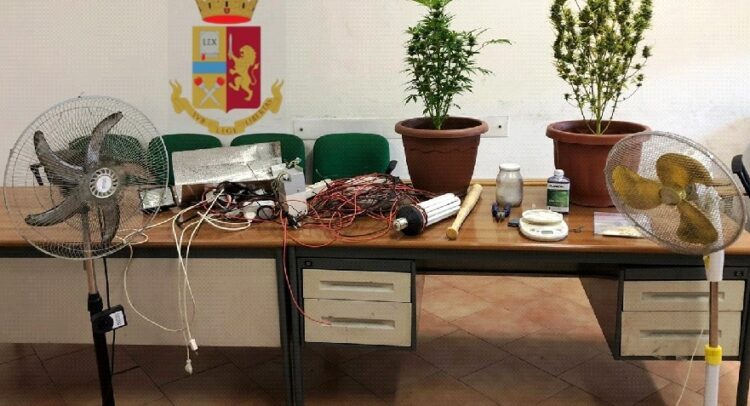 I poliziotti, una volta entrati, hanno scoperto una piccola serra per la coltivazione di piante di marijuana completa di lampada alogena per accelerarne la crescita, due bilancini, due ventilatori, diverso materiale per la coltivazione e per il confezionamento della droga e una mazza da baseball.