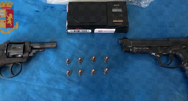 I poliziotti hanno rinvenuto, in una cantinola in uso ad un uomo e  trasformata in abitazione, una pistola Beretta semiautomatica cal. 9×21 mm con matricola parzialmente abrasa completa di caricatore con 8 cartucce Luger cal. 9×19 mm e una pistola a tamburo Lebel cal. 8 priva di matricola occultate in uno stereo mentre, in un mobile della cucina, hanno trovato un bilancino di precisione.