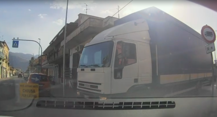 Il camion, un mezzo telonato di grosse dimensioni, è stato ripreso mentre procedeva tranquillamente nel senso opposto a quello consentito. Il conducente, dopo aver superato un incrocio dove è presente un cartello di divieto d’accesso chiaramente visibile, prosegue la sua marcia costringendo le auto che procedono nel senso corretto a manovre d’emergenza o a fermarsi del tutto.