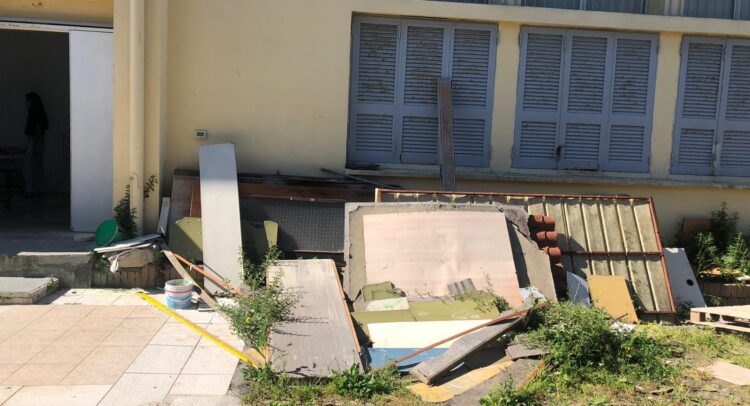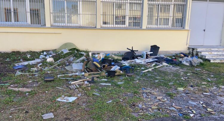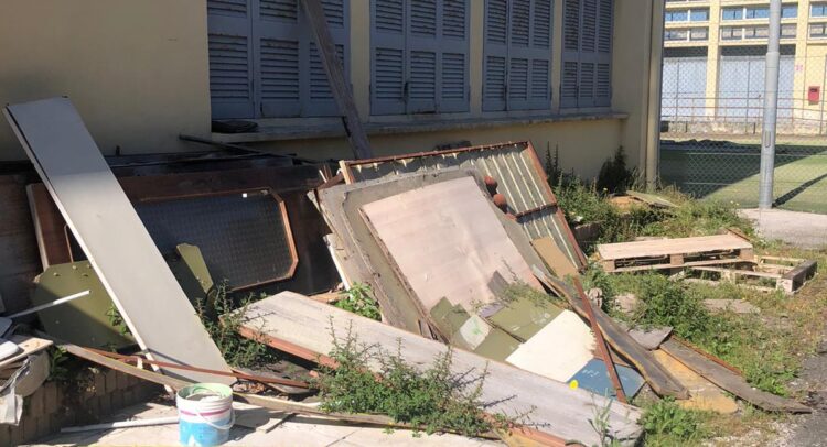 Tra i rifiuti si notano sedie, water e anche i sacchi neri che non si potrebbero più usare. E’ evidente che i rifiuti sono stati riposti a seguito di opere di ristrutturazione edilizia e vario materiale scolastico in disuso abbandonato lì all’intemperie.
