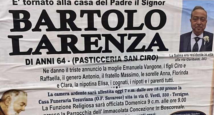 Torre Annunziata piange il pasticciere Bartolo Larenza, morto qualche giorno fa all’età di 64 anni. Una vita dedicata al lavoro, nemmeno il tempo di godersi la pensione che il Signore se l’è portato via.